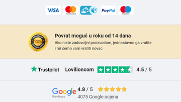 Isporuka se vrši putem kurirske službe BEX. Bićete obavešteni SMS-om, mailom i telefonom pre isporuke. Možete platiti gotovinom ili karticom, ako ste već platili proizvod, ne morate da plaćate naknadno. U poštanskom sandučetu ćete naći obaveštenje o pošiljci. Ako proizvod ne ispunjava vaša očekivanja, možete ga vratiti bez razloga u roku od 30 dana od isporuke. Vratite neoštećeni proizvod u originalnom pakovanju. Priložite popunjen obrazac za reklamaciju/povraćaj i mi ćemo vam vratiti novac ili zameniti proizvod za prikladniji proizvod iste vrednosti bez dodatnih troškova. Na taj način obezbeđujemo zadovoljstvo naših stalnih kupaca.